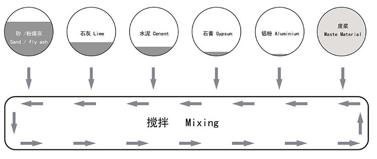 料漿、膠結(jié)料、石膏和鋁粉都分別通過相應(yīng)自動計量稱計量,后在攪拌機內(nèi)高速攪拌,澆注到模箱后進行氣泡梳理。整個體系由 PLC 系統(tǒng)進行自動控制,保證工序的精確和高效。
