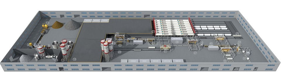 3、澆注工藝:采用固定澆注,模具移動到澆注攪拌機(jī)下方,接受澆注后,自動進(jìn)入能夠控制濕度和溫度的養(yǎng)護(hù)室,加速胚體的硬化。